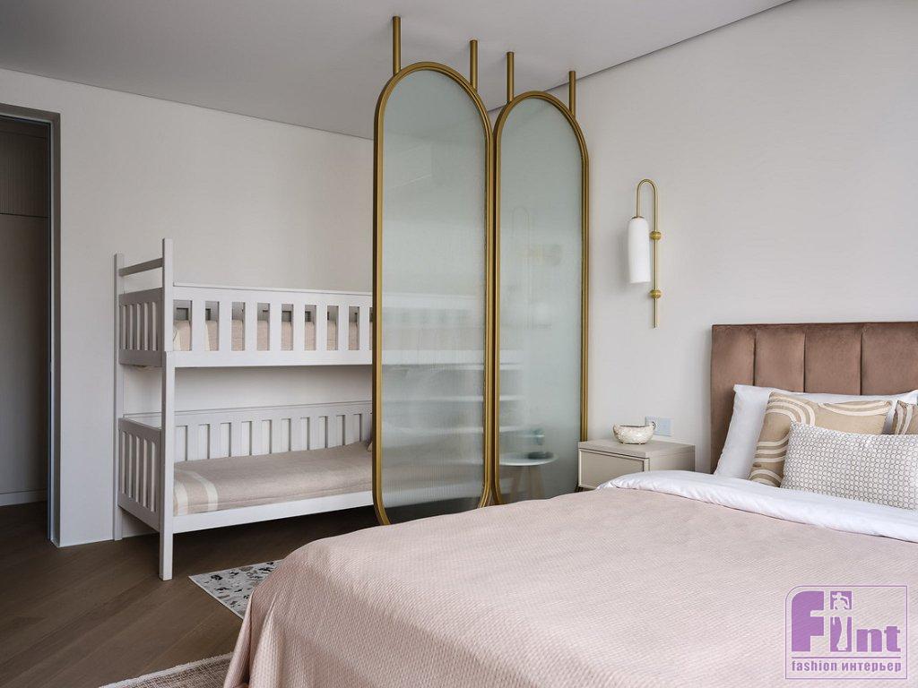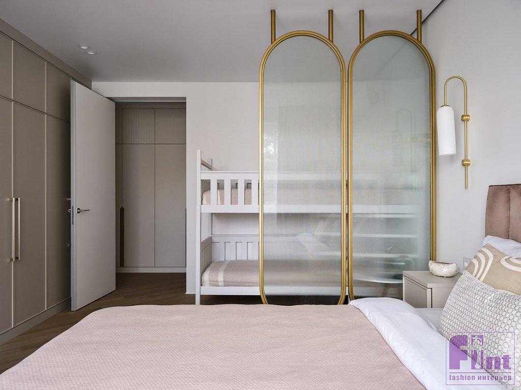 В отделке стен использовали светлую краску. В спальне бабушки разнообразили оформление 3D-панелями, окрашенными в цвет стен. В комнатах уложили на пол инженерную доску, на кухне — керамогранит под мрамор. Ванную комнату полностью отделали керамогранитом с рисунком красивого природного камня. Для зонирования пространства большой комнаты родителей дизайнер разработала перегородку: арочные формы и золотой цвет добавили пространству элегантности без помпезности, как и хотели хозяева.