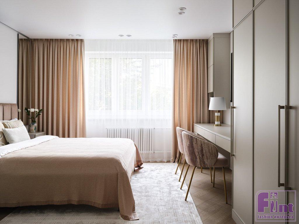 Владельцы этой квартиры в доме серии П-46 — молодая семейная пара с двумя детьми (мальчик и девочка) и бабушкой. У пары — свой небольшой бизнес, бабушка ещё молода и работает. К дизайнеру Ольге Савичевой семья обратилась с запросом на изысканный, но не вычурный интерьер в пастельных тонах. Преимущественно хотели видеть интерьер в современном стиле. Функционально требовалось сделать общую спальню для родителей и детей, комнату бабушки, предусмотреть много систем хранения.