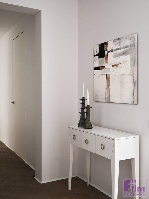 Заказчики просили продумать много систем хранения, и Ольга Савичева справилась с этой задачей прекрасно. Согласно планировке, в прихожей было отдельное помещение, которое задействовали под кладовку, там — не только место для хранения одежды и других вещей, но и дополнительная морозилка. Для создания фокусной точки в прихожей поставили консоль и повесили над ней картину.