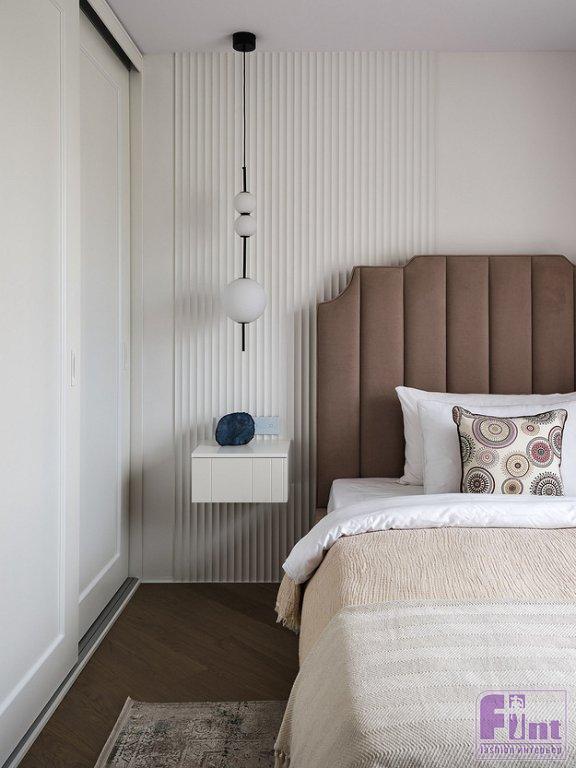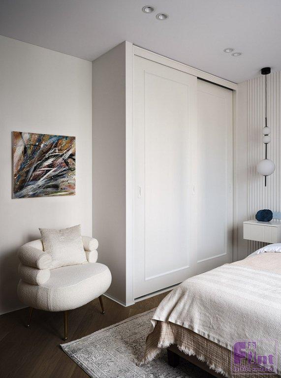 В комнате бабушки — свой шкаф, вместо двуспальной кровати стандартных размеров выбрали уменьшенную. Это позволило оставить свободное пространство. У шкафа нашлось место для кресла. Напротив кровати — подвесная консоль, переходящая в туалетный столик.