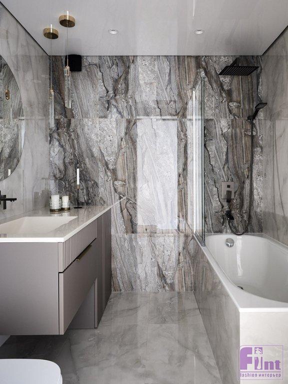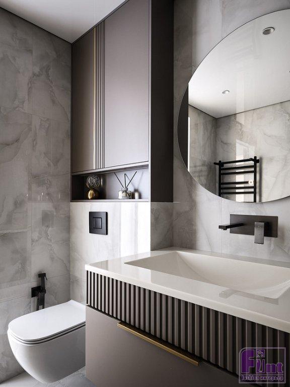 В ванной комнате — вместительная тумба под раковину, под той же столешницей поставили стиральную машину, спрятанную за дверцами. Над инсталляцией унитаза сделали шкафчик для дополнительного хранения.