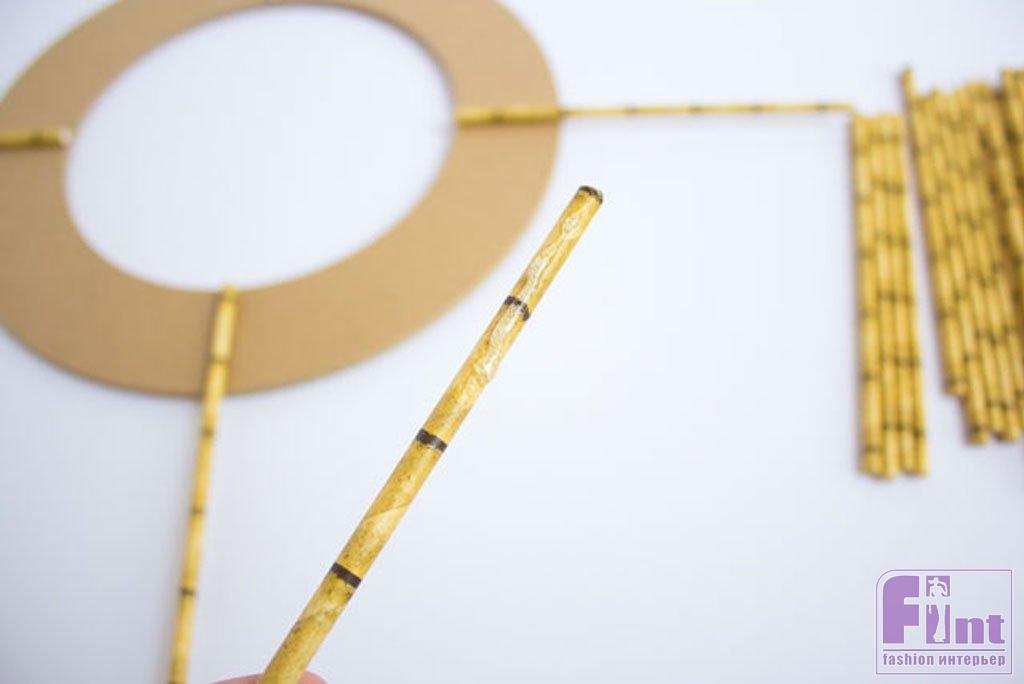 Затем поделите получившиеся сектора пополам и закрепите в местах деления секторов ещё по трубочке, следя за тем, чтобы все трубочки располагались на равном расстоянии друг от друга. Эти 8 трубочек должны быть одной длины, и приклеивать их нужно ровно, чтобы внешний край трубочек создавал окружность, повторяющую окружность картонного кольца.
