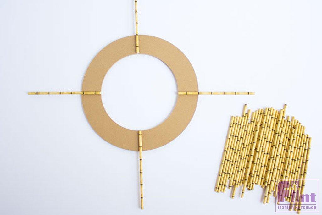 Для того чтобы наша рама для зеркала-солнца была красивой и симметричной, необходимо разделить кольцо на четыре равных сегмента, как на циферблате часов где присутствуют только значения 12, 3, 6 и 9 часов. С помощью клеевого пистолета прикрепите по трубочке к каждому из сегментов на 12, 3, 6 и 9 часах. У вас получится крест из длинных трубочек.