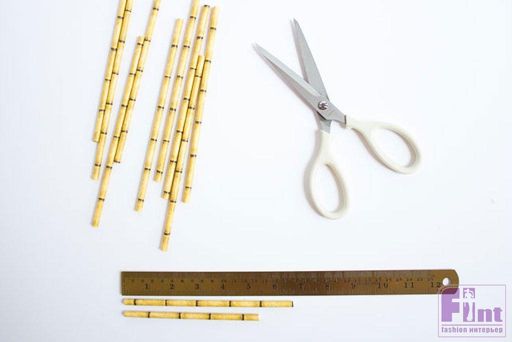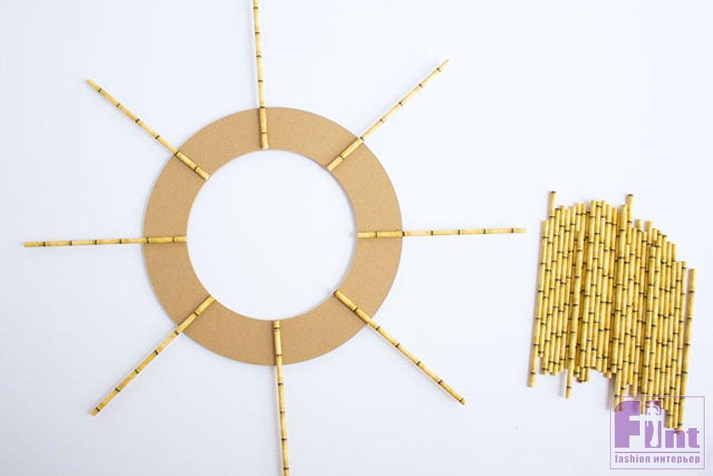 Теперь пришло время сделать для нашего зеркала-солнца более короткие лучи. С помощью ножниц укоротите трубочки, чтобы заполнить оставшиеся промежутки. Мы сделали более короткие трубочки двух размеров: около 16 см и 13 см.