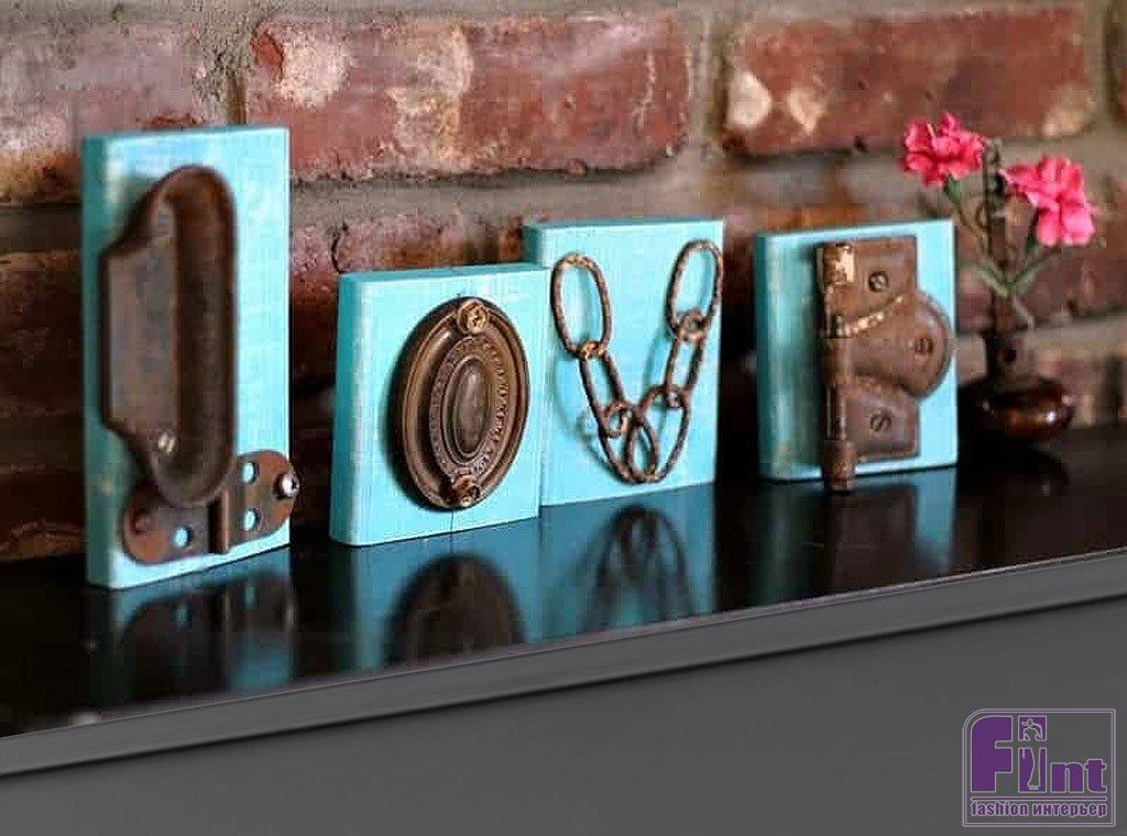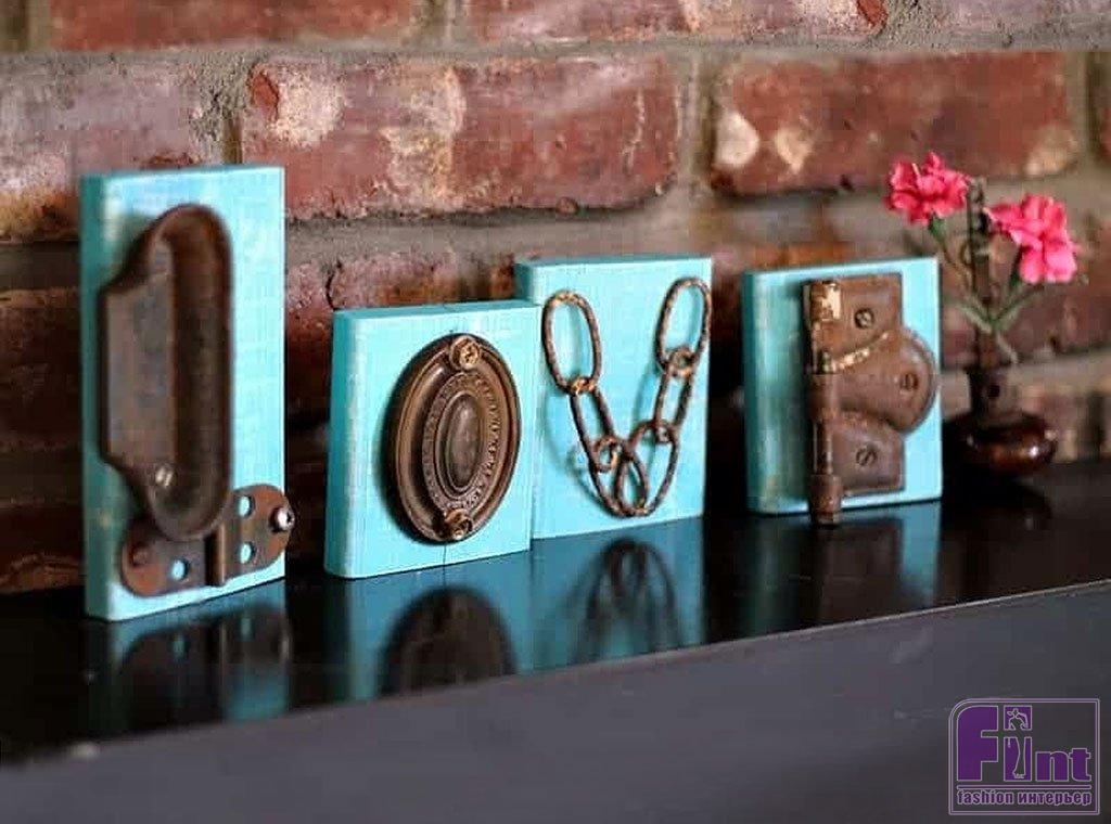 Пока краска на деревянных заготовках сохнет, займитесь подбором необходимого количества шурупов для крепления металлических предметов к заготовкам. После высыхания разложите найденные металлические предметы на заготовках, чтобы визуально получились буквы «L-O-V-E». Тут всё зависит от вашего видения, поскольку выложить буквы можно практически из чего угодно. Естественно, ваши металлические предметы должны иметь отверстия для крепления, или их можно закрепить, как звенья цепи. Если отверстий нет, их всегда можно просверлить. Когда краска подсохнет, деревянные заготовки можно немного «состарить», слегка обработав их наждачной бумагой.