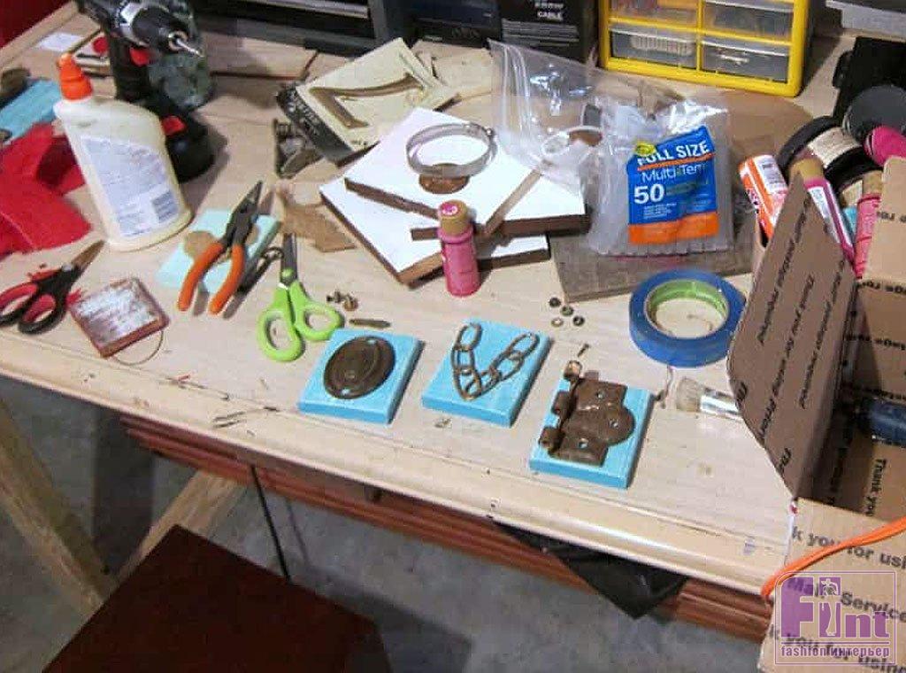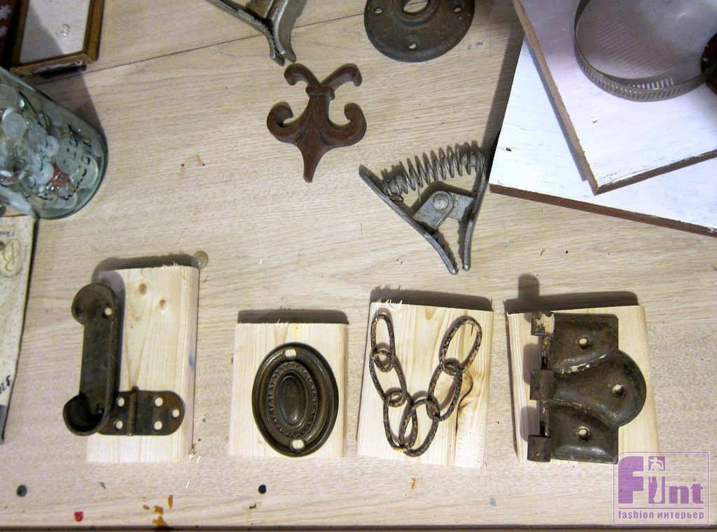 Теперь осталось подобрать подходящие предметы для создания из них силуэтов, напоминающих буквы «L-O-V-E». Покопавшись в старом хламе, мы нашли несколько старых ржавых деталей, которые вполне сложились в нужные буквы. Нам пригодились: две старых петли, обрывок цепи из шести звеньев, декоративная мебельная накладка и какая-то непонятная железка в виде необычной маленькой продолговатой «миски», напоминающая старую пепельницу. Вы можете использовать практически любые подходящие предметы. Важно, чтобы они были в одинаковом «состаренном» состоянии. В нашем случае, все предметы были почти одинаково покрыты слоем ржавчины.