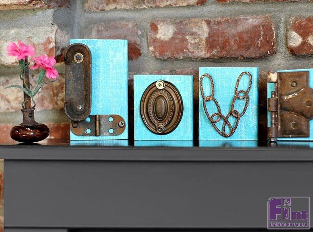 Такие ржавые элементы нуждаются в ярком и красочном фоне. Поэтому мы покрасили деревянные заготовки в очень красивый бирюзовый оттенок. Этот цвет прекрасно сочетается с коричнево-чёрным цветом металлических предметов, из которых мы сложили буквы английского слова «ЛЮБОВЬ».