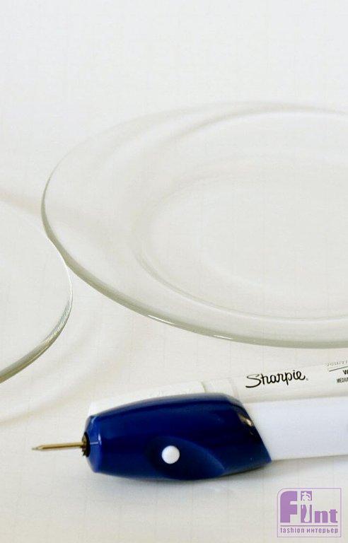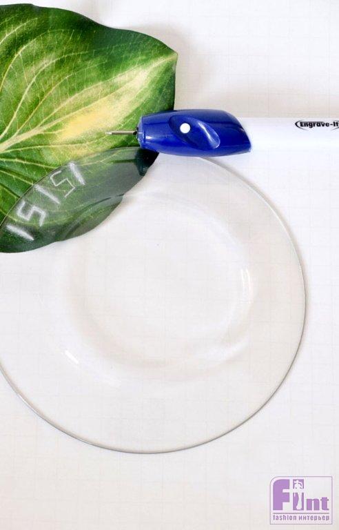 Чтобы наше блюдо выглядело более декоративно, мы решили украсить тарелки этническим орнаментом по краям. Для создания этого узора мы применили гравировальную ручку, которая легко делает на стекле заметные борозды. Если у вас нет под рукой такого инструмента, вы вполне можете просто нарисовать орнамент стойким маркером. Для создания уникального вида мы выгравировали узор на трети тарелки, а не на всей поверхности. Повторите узор на второй тарелке. Промойте тарелки водой, чтобы удалить остатки гравировки. Если вы используете маркер, просто дайте ему хорошо высохнуть.