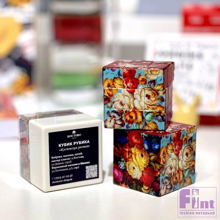 Необычная новинка от Жостовской фабрики декоративной росписи и бренда Friend Function доступна в официальном магазине фабрики по цене 1700 рублей. Кубик Рубика с традиционной жёстовской росписью на гранях пополнил коллекцию сувенирных пазлов и головоломок от фабрики, в которую также входят семь ярких деревянных пазлов, копирующих легендарные авторские Жостовские подносы.
