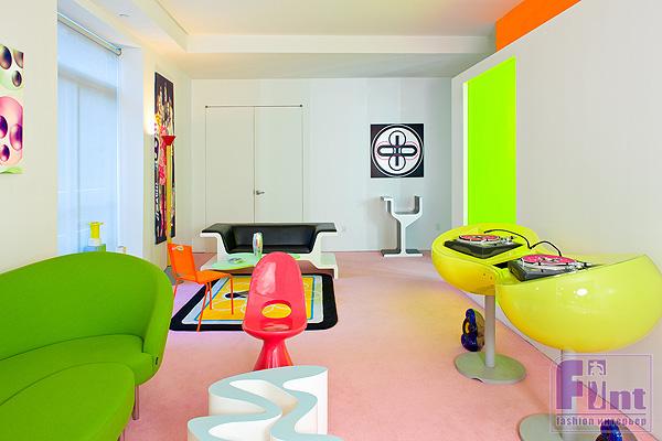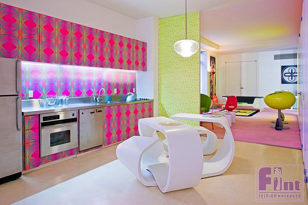 Эта невероятно яркая, наполненная сочными цветами, квартира находится в Нью-Йорке. Автор такого креативного дизайна - Karim Rashid. Кислотные цвета, их изобилие, геометрические рисунки - все это сбивает столку. Очевидно, что не все смогут жить в квартире с таким необычным интерьером. А Вы смогли бы жить с таким интерьером?
