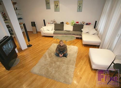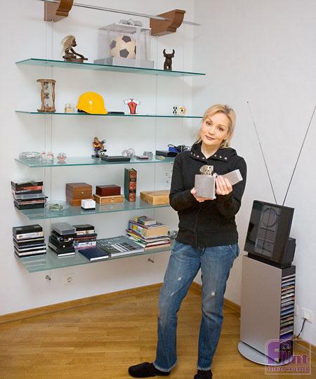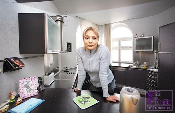 Одним из любимых мест Татьяны в новом доме является гостиная. Она очень просторная, с непривычно высокими потолками, да и из мебели в ней присутствует только роскошный большой диван, журнальный столик и огромная плазменная ТВ-панель. Причём, за счёт прозрачной стеклянной подставки, создаётся ощущение, что эта ТВ-панель будто бы парит над полом. Не обошлось в гостиной Булановой и без камина, который из-за особого дизайна и формы пришлось полностью делать на заказ. Дополнительный объём помещению придаёт очень светлая, почти белая окраска стен. Чтобы избежать появления трещин на таких больших пространствах, в проекте было предусмотрена защита поверхностей при помощи малярного стеклохолста.