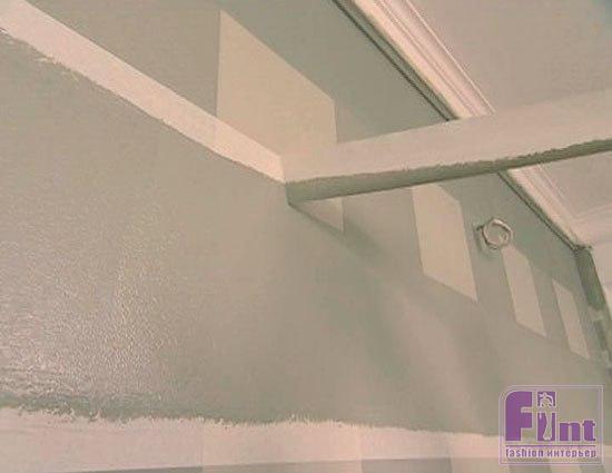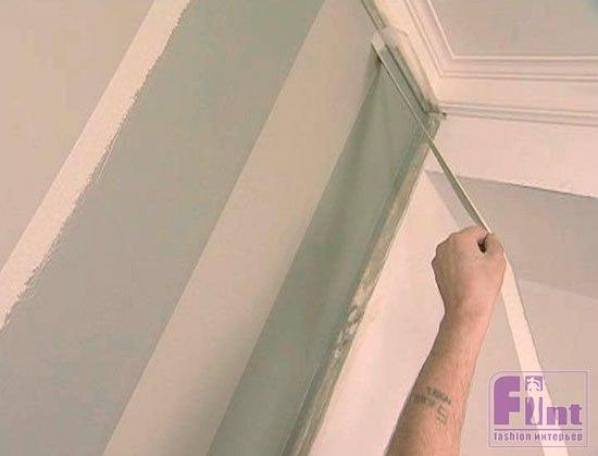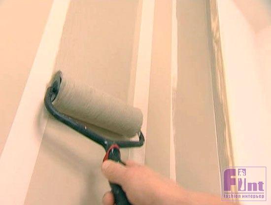 Чтобы поверхность стала бархатной, похожей на легкий ворс, в состав акриловой краски на водной основе можно добавить небольшое количество загустителя. Первый слой наносим валиком.
