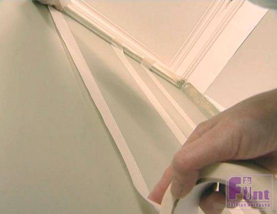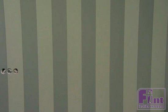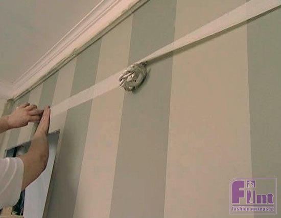 Затем при помощи лазерного уровня на стене размечаем орнамент. С помощью малярного скотча обозначаем вертикальные полосы и красим в другой цвет – в данном случае более темный оливковый.