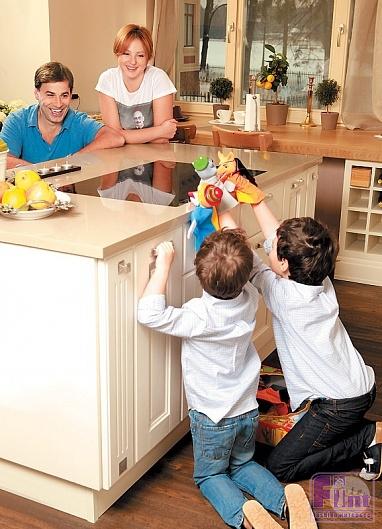 Хозяйская спальня представляет собой единый комплекс с гардеробной и отдельной ванной. Анне пришлась по душе идея не разделять спальню и ванную дверьми. Получилось единое пространство — уютное и интимное. Впрочем, посторонним туда вход воспрещен. Гостей принимают в просторном зале, который удачно сочетает функции кухни, столовой и гостиной. В центре кухонно-столовой зоны находится остров с плитой и широкой столешницей. Можно сесть на стулья, расставленные вокруг, и наблюдать за кулинарным спектаклем под названием «приготовление пищи». Находчивые братья нашли кухонному острову еще одно творческое применение: используют его в качестве ширмы для кукольного театра.