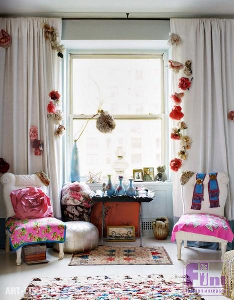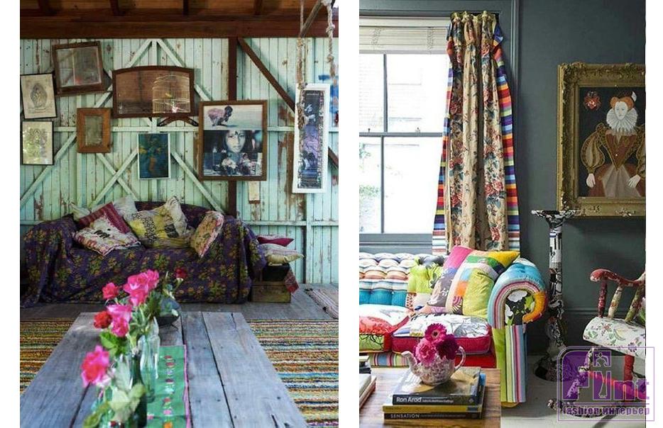 Интерьер в стиле бохо всегда несет на себе отпечаток характера и увлечений своего хозяина. В нём заложена насмешка и ирония над всеми стилями и самим собой, искрящаяся разноцветная радость, но в то же время теплота и душевность. Это один из немногих стилей, к которому в полной мере применимо правило абсолютного отсутствия правил. Здесь стены, выдержанные в строгих не броских тонах, в совокупности с ультра-модной мебелью ломает один-единственный коврик кислотного цвета или шторы в кричащем китчевом стиле. Или среди вороха лоскутных покрывал и подушек с этническими узорами вдруг мелькнет столик или кресло в стиле хай-тек. Элементы интерьера эклектично перемешиваются между собой, создавая невероятные коктейли из цветов и форм.