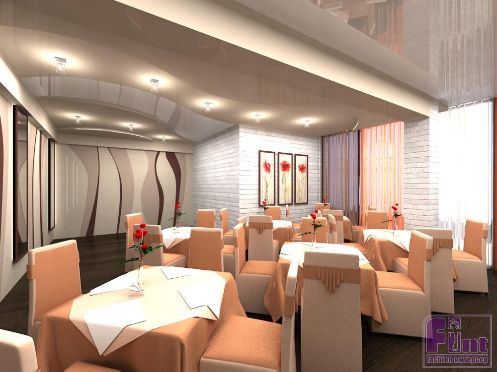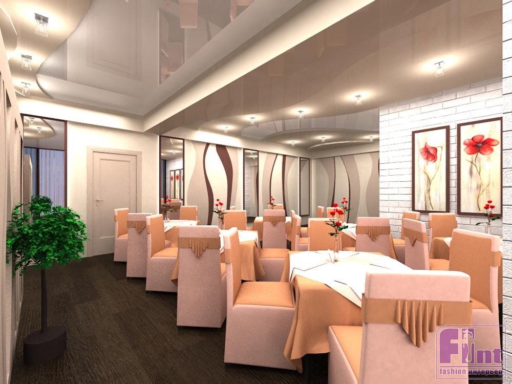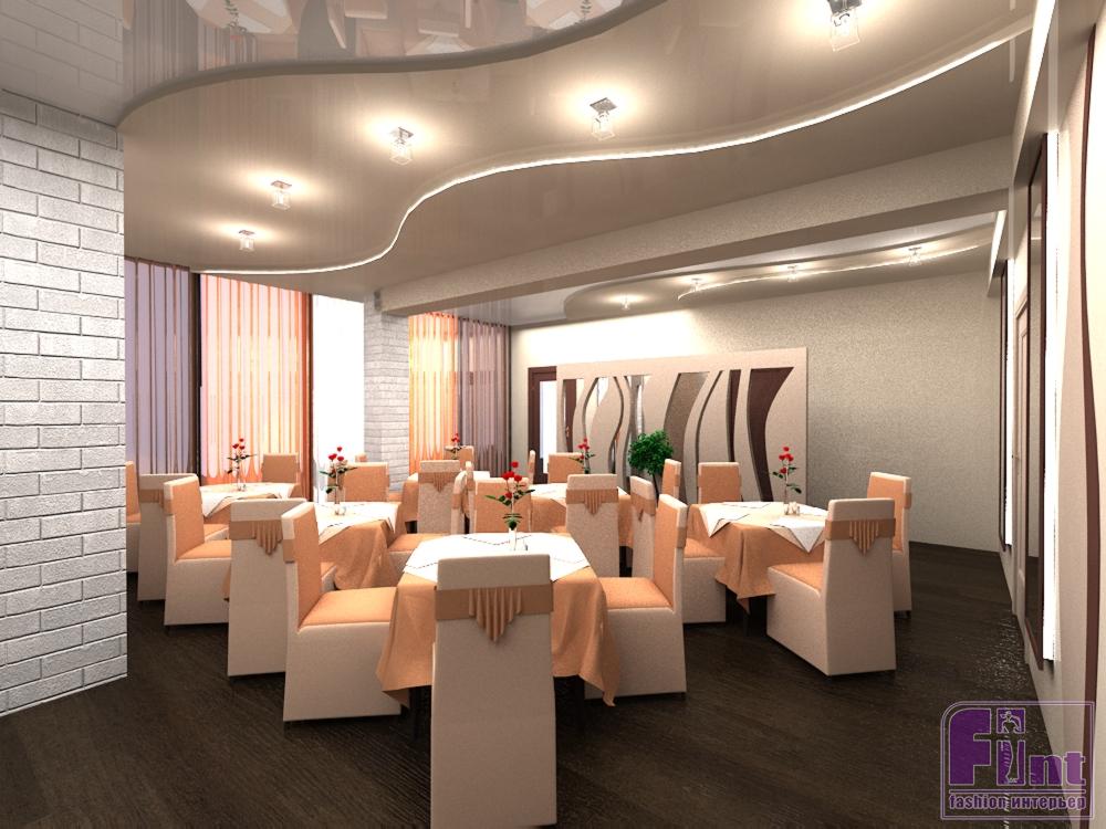 Очень нежный и чуткий, с плавными линиями и неброскими цветами, этот дизайн притягивает взгляд, цепляя своей скромностью, подкупая обычностью. Посмотрите внимательнее, разве это похоже на привычный нам образ банкетного зала? Это помещение настолько теплое и уютное, что создает скорее ощущение дома. Когда попадаешь внутрь, кажется, что ты пришел к старым добрым друзьям на праздник. Или вернулся домой из долгого путешествия аккурат к банкету, на который обязательно приедут все близкие и дальние родственники, чтобы послушать твои истории о дальних странах! Чтобы достичь такого чудесного эффекта, Юлия использовала в своем проекте цвета и материалы, которые чаще всего выбирают для дачи или дома: деревянные полы, окрашенные в нежно-персиковый цвет стены, мягкие занавески на окнах и встроенные в натяжной потолок светильники.