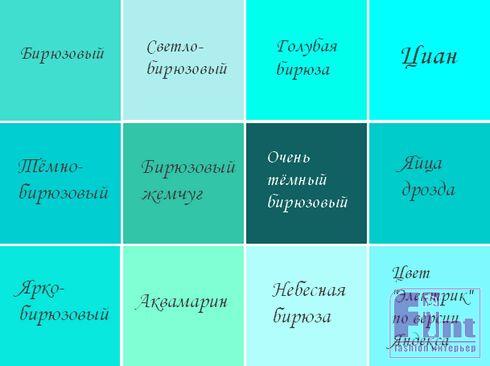 Бирюзовый - не однозначный цвет, а многоликий, его оттенки позволяют решить практически любые задачи в рамках выбранной цветовой бирюзовой гаммы. Есть цвет "циан", есть "зелёная сосна", есть "яйца дрозда", и даже неведомый "виридиан" и "вода пляжа Бонди"!
