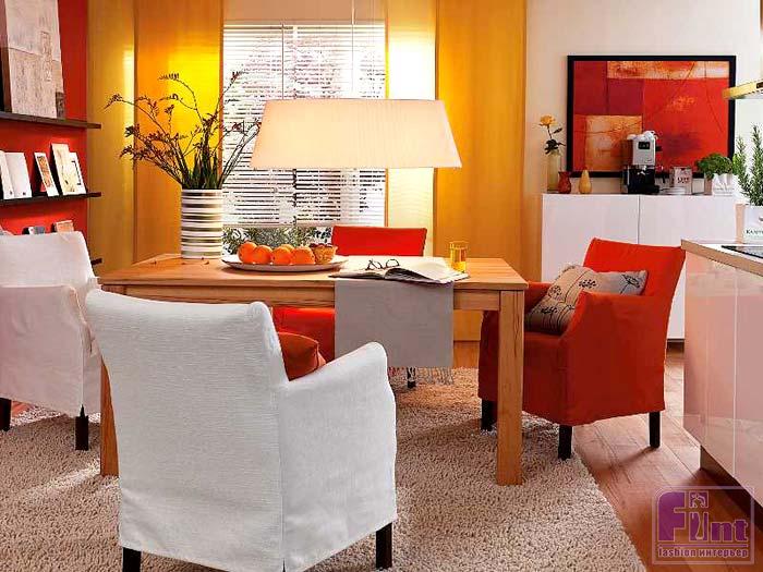 Так, оттенки оранжевого цвета компенсируют недостаток естественного освещения в комнатах с окнами, выходящими на север. А если окна комнаты выходят на восток или на юг, от использования оранжевого в дизайне интерьера лучше отказаться: он заставит комнату казаться слишком жаркой и светлой. Учтите, что оранжевый обладает способностью зрительно приближать предметы, поэтому он не слишком хорошо подходит для отделки стен в маленьких комнатах (кухня, ванная).