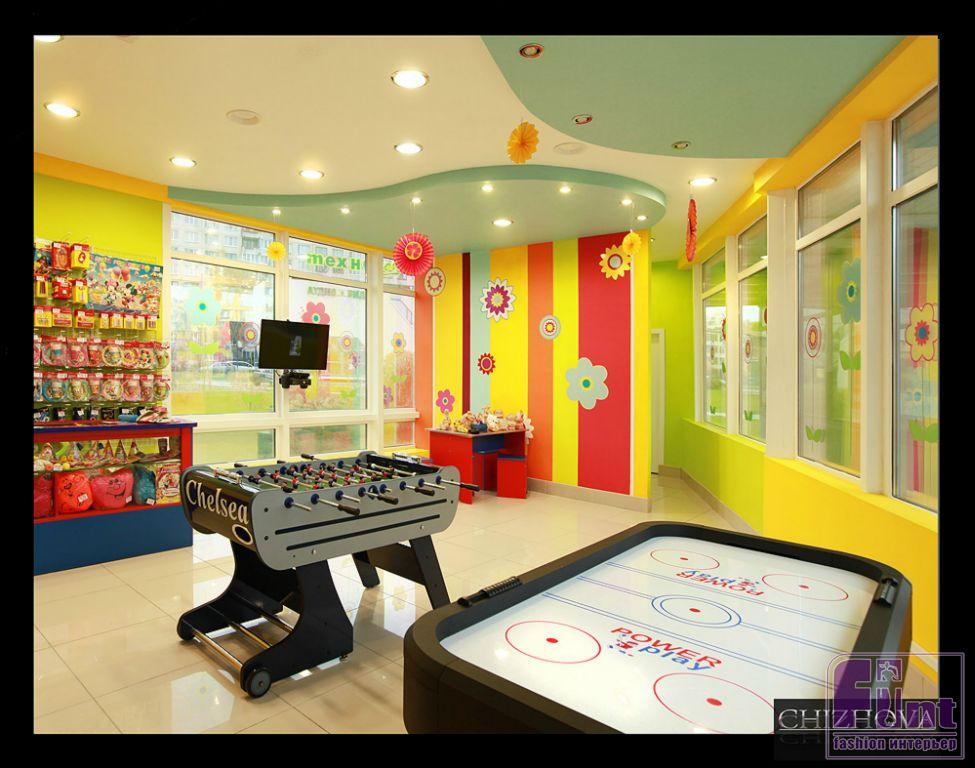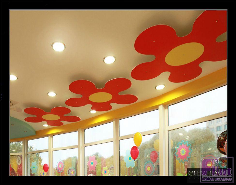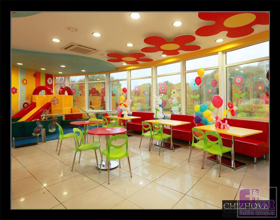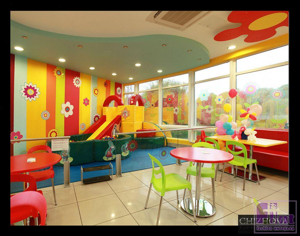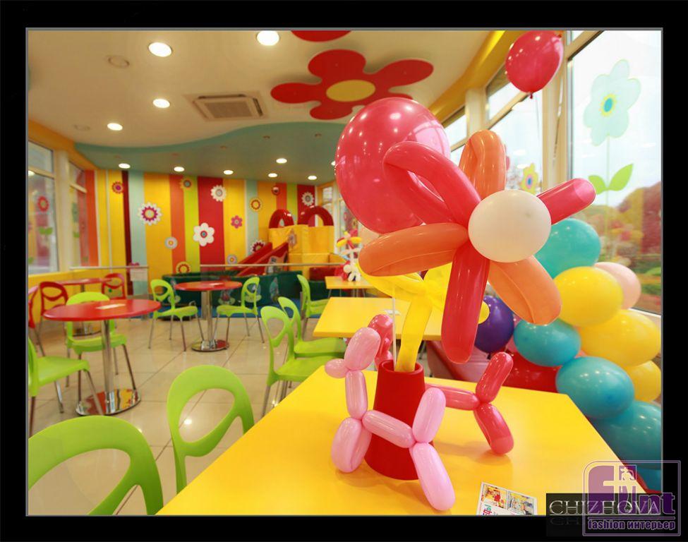 Интерьер изобилует яркими красками и привлекающими внимание деталями: цветами, солнышками, игрушками и шариками. Разноцветная мебель обтекаемых форм, детский городок и сочные краски – кажется, этого с лихвой достаточно, чтобы увлечь ребенка.