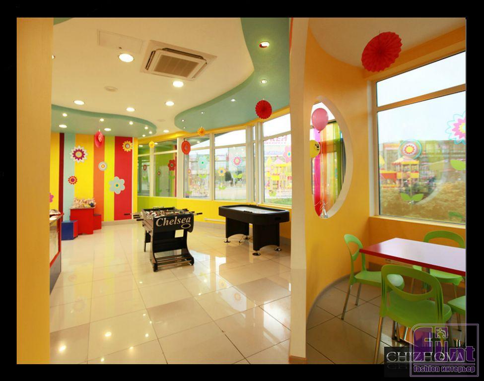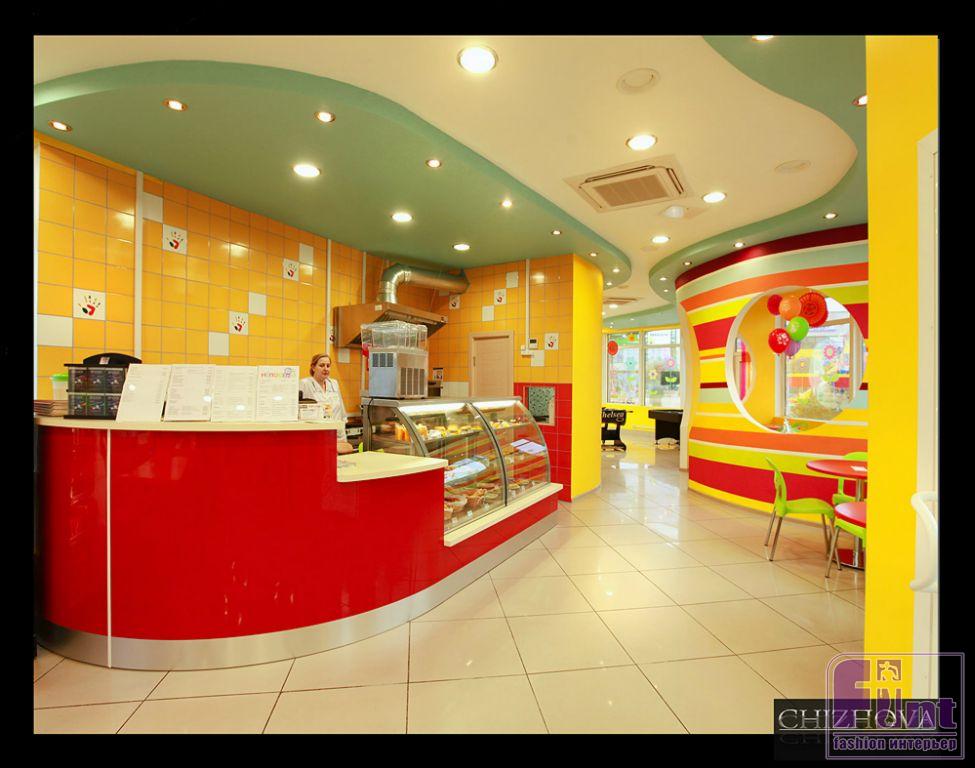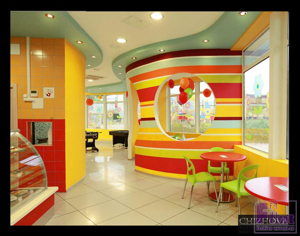 Поскольку кафе ориентировано на детей, к выбору отделочных материалов дизайнер подощёл с особым вниманием. Мы всегда хотим по максимуму обезопасить своих детей от этого страшного мира, поэтому наверняка любой родитель будет лучше чувствовать себя в кафе, которое отвечает всем нормам безопасности. К безопасным отделочным материалам относятся краски на водной основе, которые не имеют запаха и, как следствие, не могут спровоцировать аллергию. А, чтобы краски было удобнее наносить на поверхность, часто в качестве основы под краску выбирают стеклотканевые обои, которые могут быть, как гладкими, так и фактурными. Экообои, сплетенные из стекловолокна не распространяют пожар, не накапливают на себе статического электричества и вообще со всех сторон положительные.