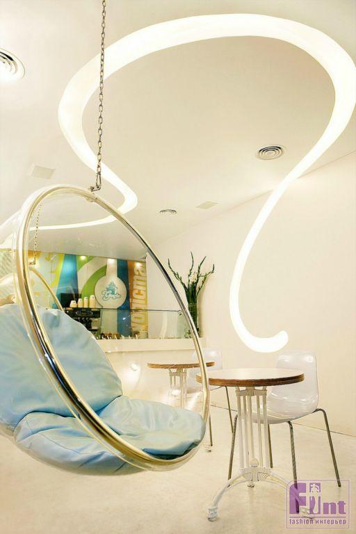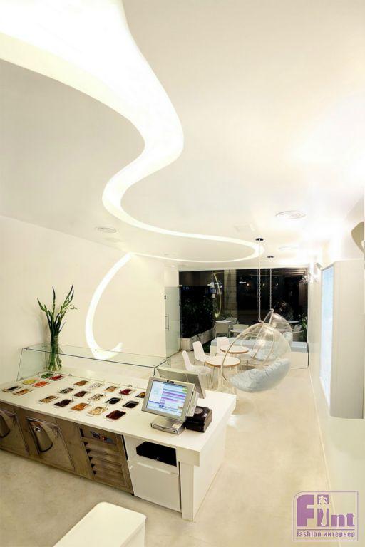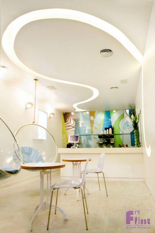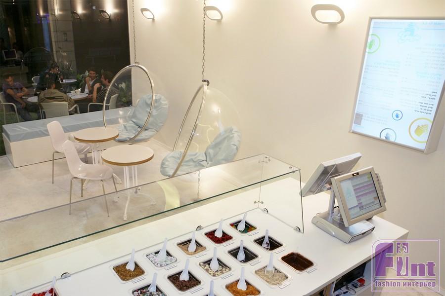 Этот светлый, яркий и необычный интерьер нового йогурт-бара в городе Ашдод, Израиль, прекрасно иллюстрирует мастерство дизайнеров из студии Dana Shaked. Особенность этого интерьера - очень маленькая общая площадь. Для ее визуального увеличения дизайнеры были вынуждены использовать все возможные современные приемы. Основным визуальным приемом, предложенным создателями интерьера, было максимальное использование белого цвета и ярких светлых оттенков. Кроме того, удачное расположение светильников и скрытой подсветки помогли зонировать пространство и создать еще более выраженный эффект иллюзии обширного пространства.