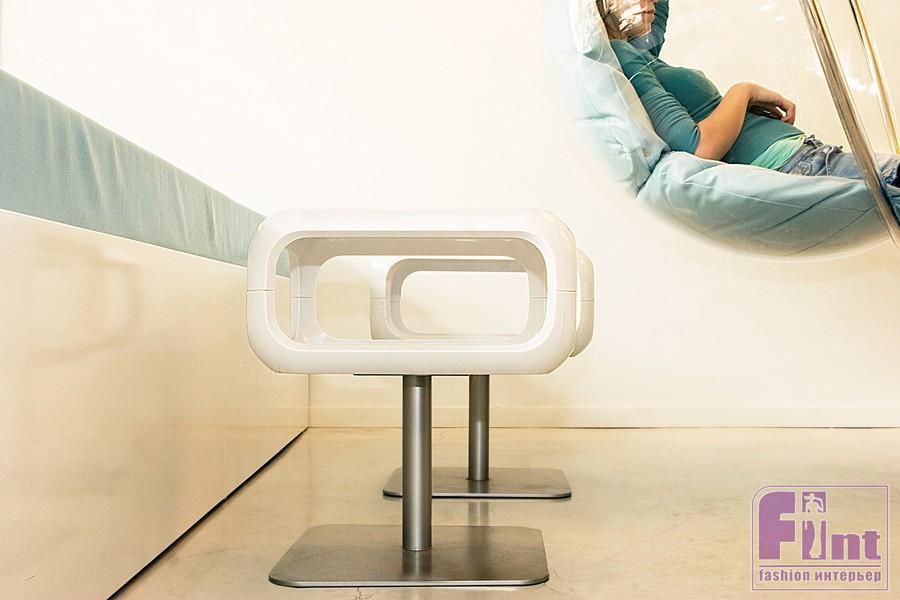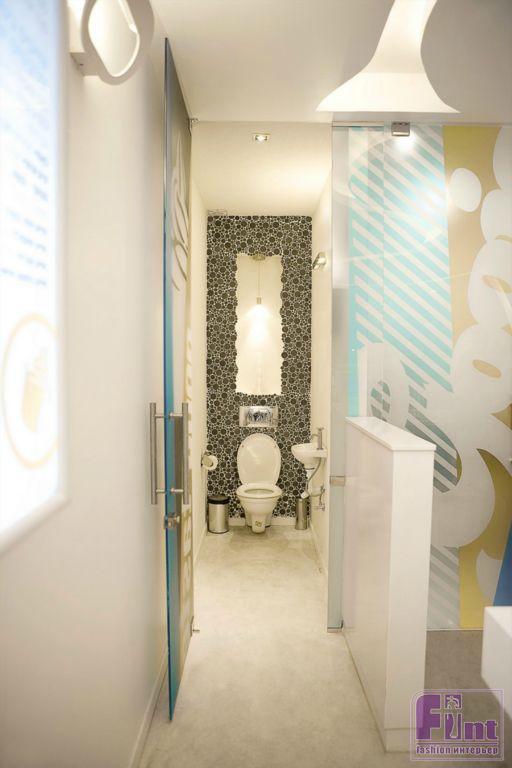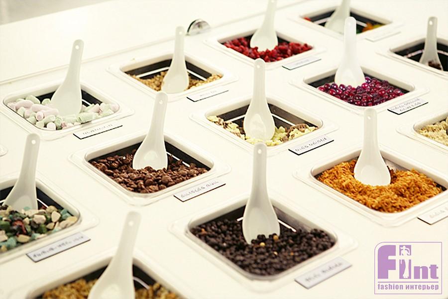 Главным элементом дизайна стала массивная столешница с чашами и набором специй, с помощью которых каждый посетитель найдет для себя свой уникальный йогурт или молочный коктейль. Особого внимания заслуживает туалет в йогурт-баре, несмотря на небольшие размеры его дизайн максимально функционален и соответствует общей концепции легкости и воздушности интерьера.