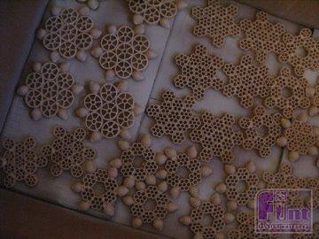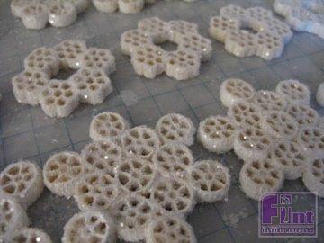 Макароны forever! Чего только из этих макарон не делали…Вот добрались и до снежинок. Недорогая идея для детской поделки. Понадобятся макароны различных форм и размеров, клей ПВА, глиттер серебристого цвета, кисть. Из макаронных изделий предварительно выкладываем снежинки: круглые, остроконечные - какие получатся, такие и хорошо. Выложили, убедились, что снежинки очень даже ничего, смазываем обильно каждую макаронинку и крепим с соседней. Сверху, снизу и по бокам также обильно промазываем клеем всю снежинку целиком. Пока клей не высох, кистью или просто щепоткой притрусите снежинку сверху серебристым глиттером. Когда клей высохнет, снежинку можно подвесить за ниточку или ленточку на ёлку.
