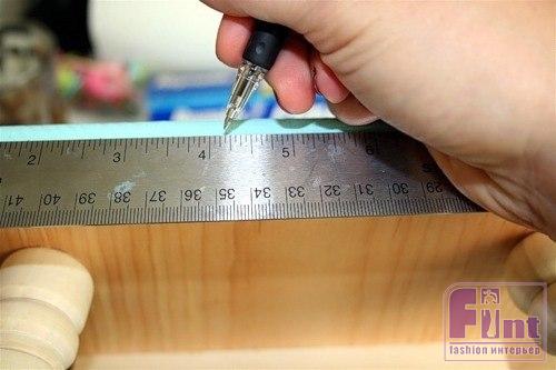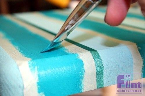 Отмеряем с помощью линейки равные расстояния на крышке стула и наклеиваем бумажный или обычный скотч. Не переусердствуйте, не нажимайте слишком сильно, чтобы скотч не оторвал часть краски.