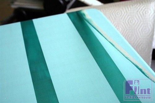 Еще раз наклеиваем скотч – на этот раз со сдвигом – заклеивая часть тёмных полос. Красим промежуточным оттенком голубого.