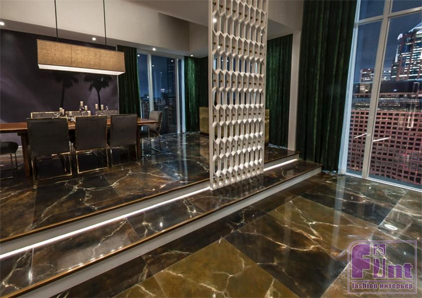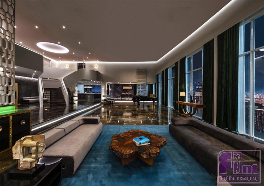 Ажурные перегородки поставили для зонирования открытого пространства пентхауса. Для той же цели сделали подиум, на котором разместили столовую. Синий ковер на полу служит контрастным фоном для диванов, которые слились бы по цвету с окружающим интерьером.