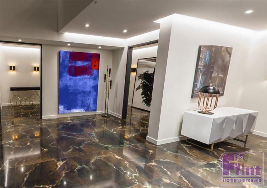 Авангардные живописные полотна выглядят особенно ярко на фоне нейтральных стен, окрашенных в модный серый оттенок. Кухню с гладкими темными фасадами и лаконичной фурнитурой однозначно можно отнести к стилю минимализм. Мягкий уголок в спальне наиболее напоминает номер в дорогом отеле.