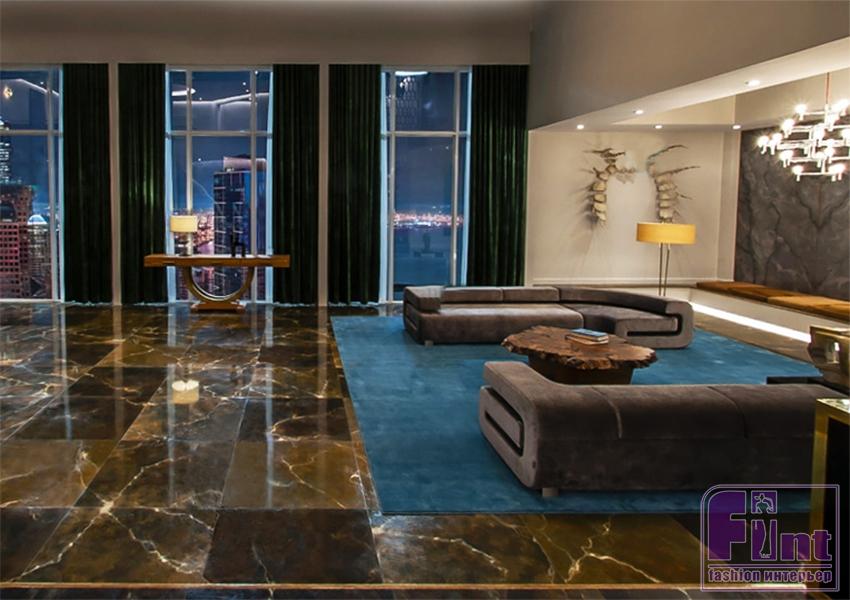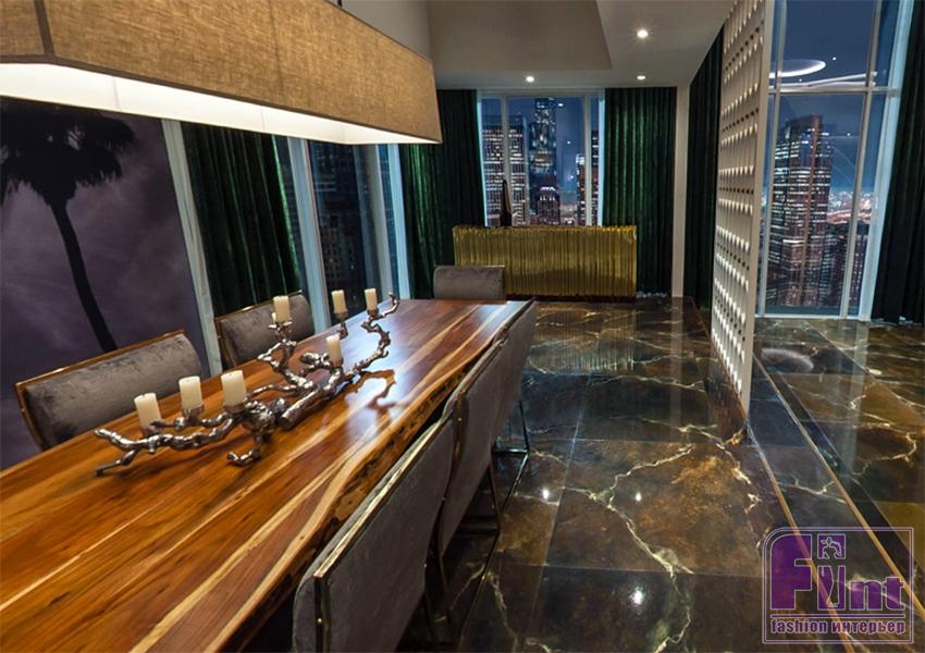 В итоге интерьер пентхауса Кристиана Грея получился в стиле городской шик, где дорогой натуральный камень сочетается с конструкциями из металла, диваны простой минималистичной формы соседствуют с предметами из цельного дерева в экостиле, а нейтральные крашеные стены украшают авангардные картины.