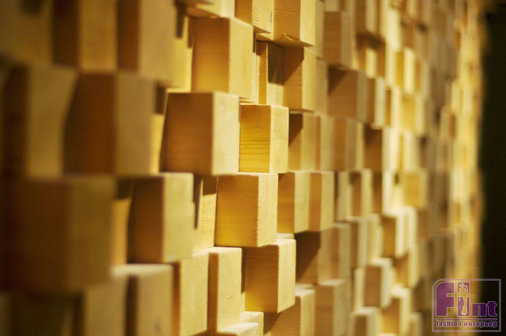 Для стен использовали обычный клееный брус – но посмотрите, как это потрясающе выглядит! Этот брус был нарезан дольками, как колбаса – благодаря этому получились прямоугольники разной глубины. Затем его равномерно разложили по полу и аккуратно перенесли всю конструкцию на стены. Получился объёмный и очень фактурный паттерн.