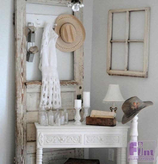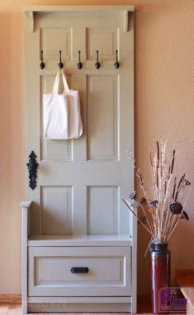 Из старой двери получится компактная вешалка для прихожей. Укомплектуйте ее зеркалом, полочками и крючками. Между филенками поместите фотографии, остатки зеркала. Можно расположить горизонтально, прикрепив на стену. Или - вертикально, например, с опорой на тумбу, которая послужит и ящиком для обуви, и скамеечкой.