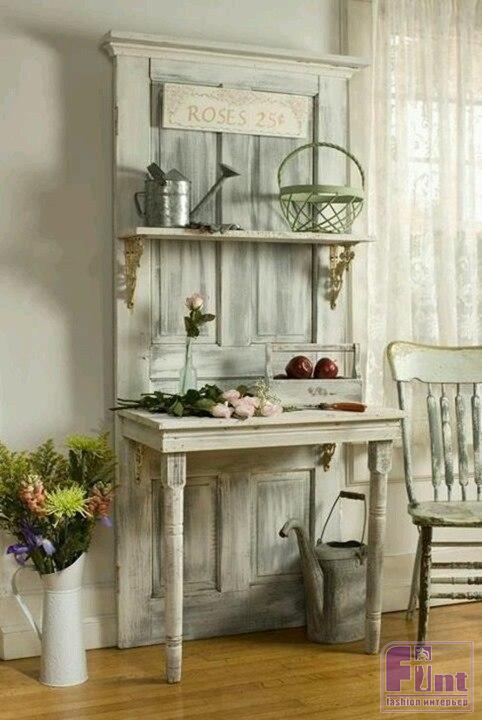 Как правило, в ходе перевоплощения к старой двери присоединяется еще один или несколько элементов (полки, ножки и т.д.). Для гармоничного вида декораторы рекомендуют окрасить всю конструкцию в единый цвет. Если вы предпочитаете еще и патину, - она должна появиться на всех элементах, за исключением металлических частей.