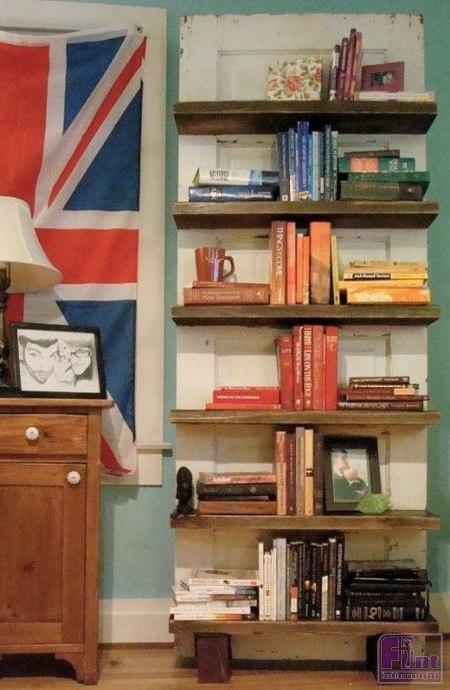 Вы знали, например, что из дверного полотна можно сделать… стеллаж? Да, настоящий полноценный стеллаж для книг, картин и всяких мелочей - декоративных или размещенных в коробках. Оптимальный вариант двери - остекленная. Вынимаем стекло, а на его место (перпендикулярно полотну) помещаем деревянные полки, обрезанные по размеру. Прикрепляем полки уголками или подвешиваем на цепочки.