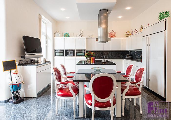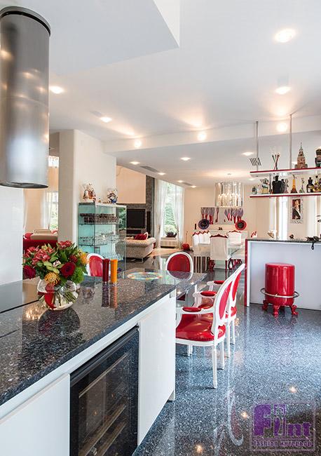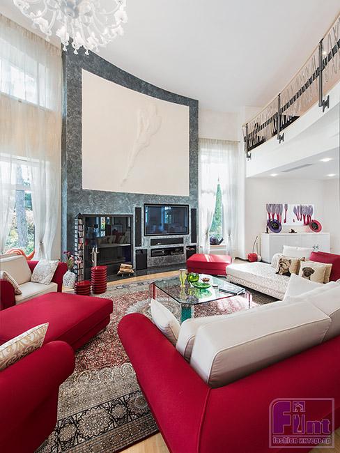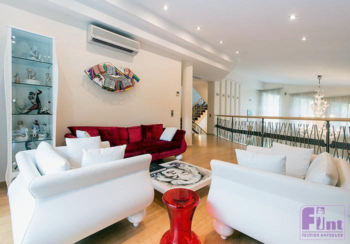 - Да, но уже сугубо семейная. Замечательно, что отсюда открывается полный обзор первого этажа. Здесь установлены белые кожаные кресла и красный велюровый диван от компании Moda, над которым расположена инсталляция с книгами в ярких обложках, журнальный стол с изображением на столешнице Мэрилин Монро. Эта маленькая гостиная прекрасно подходит для отдыха. Семейную тему, кстати, продолжают и наши фотографии в картинных рамах, размещенные на стенах галереи.