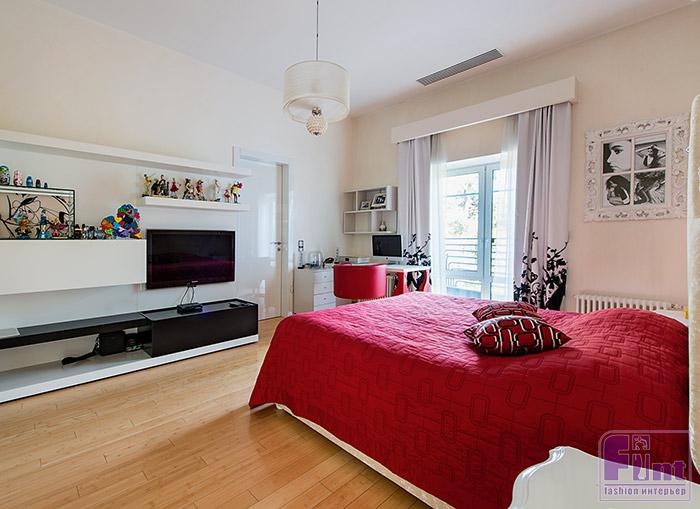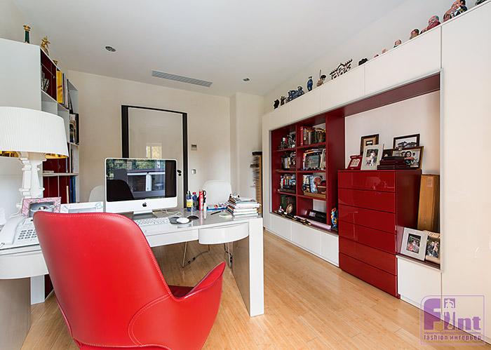 - Пожалуй, нет. Я же редко бываю дома, всегда в разъездах, поэтому он используется в основном женой и старшей дочерью. Я считаю это рациональным. А выполнен он в той же цветовой гамме, что и другие помещения: светлый деревянный письменный стол, покрытый лаком и обтянутый кожей, красное кресло, глянцевые бело-красные стеллажи.