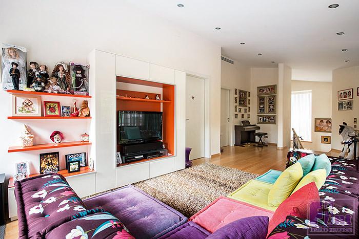 - Разумеется, это же визитная карточка дома. Внутри входная зона отделена высокими стеклянными дверями с металлическими поручнями, сделанными на заказ. Люстра, похожая на паутину, напоминает детям праздник Хеллоуин, по обеим сторонам от зеркала — красные бра. Здесь установлен алого цвета диван, который смотрится по-королевски, консоль от Moda, на стене между нишами с разнообразными статуэтками — красочное панно с бабочками от известного израильского художника.