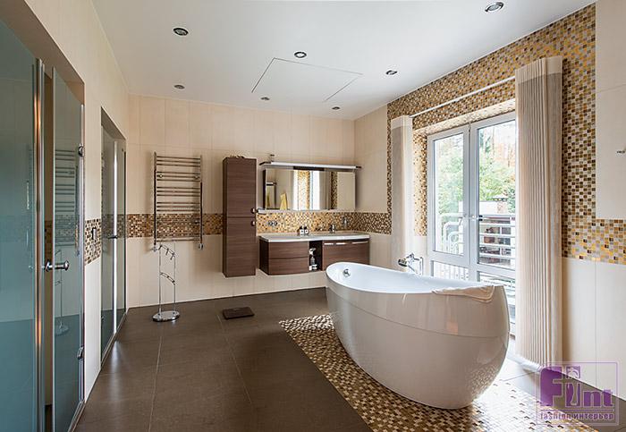 - С самого начала работы над проектом было два обязательных условия: огромная гардеробная, куда бы помещались все костюмы и платья, и незагроможденная спальня. В спальне у нас только золотистая, обтянутая кожей кровать от Fendi, консоль, комод, миниатюрный диван той же марки. Люстра с плафонами-розами прекрасно сочетается с рисунком покрывала. В изголовье кровати — картина с тюльпаном. Рядом со спальней расположена ванная комната в бежевых тонах с отдельно стоящей ванной и выложенной мозаикой душевой кабиной. Вся сантехника от Villeroy&Boch. Отсюда есть выход на балкон.