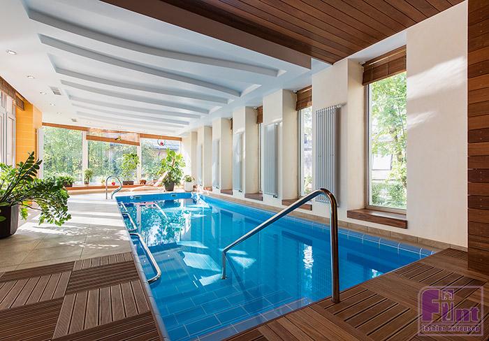 Так, первый этаж с двойным светом, большими окнами с легкими шторами — полностью гостевой. Он включает в себя холл, кухню со столовой, гостиную с каминной зоной и белым роялем немецкого производства. Стены здесь выкрашены в белый цвет, полукруглые двери — от фирмы Union, на полу — буковый паркет. Из него же изготовлены и подоконники — они низкие, чтобы на них было удобно сидеть. Ступени лестницы тоже выполнены из бука.