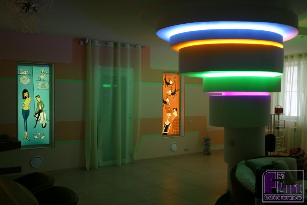 Помимо выделения зон и элементов, светодиоды используют для декорирования каких-либо объектов и предметов, то есть светодиоды в данном случае используются лишь для эффектности и эстетики. Это, например, украшение цветной подсветкой потолка, стыка пола и стены, а также мебели.