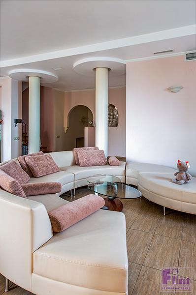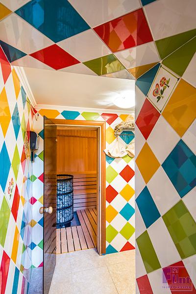 На цокольном этаже устроена так называемая зона релакса, где можно отдыхать в домашнем кинотеатре, ужинать за старинным столом рядом с антикварным буфетом, любоваться полотнами Юрия Обухова. Или париться в сауне. Кстати, в предбаннике я поставил обычную плетеную мебель из ИКЕА, а саму сауну оформил в таком «клоунском» духе, в стиле «Арлекино»: купил самую дешевую плитку разных цветов и соединил ее вместе. Получилось весьма жизнерадостно.