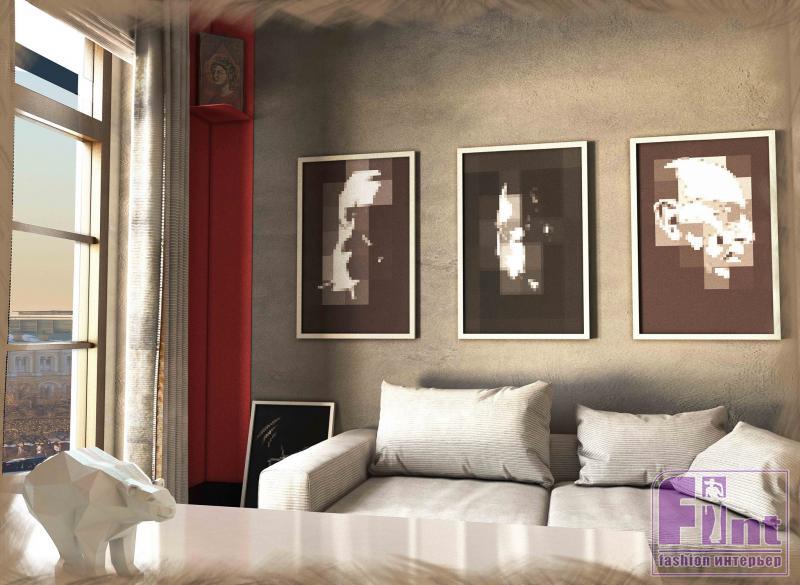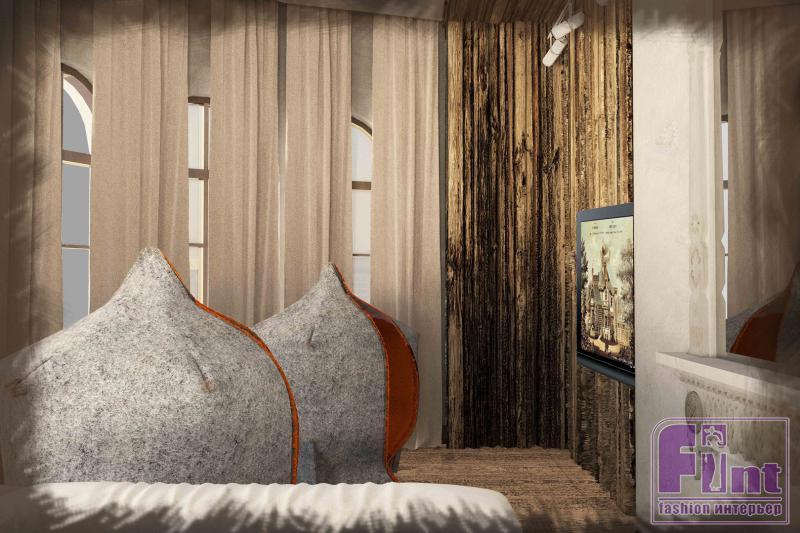 Стены зачастую окрашены краской или покрыты декоративной штукатуркой. Широко распространено изображение героев национальных сказок на стенах - как и представлено в этом студенческом проекте. Ткани предпочтительо использовать льняные, цвета - белый, серый, красный, золотой. Так же и цветочные орнаменты - характерный элемент русского стиля, который студенты продемонстрировали на примере гостиной.