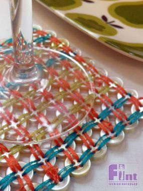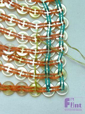 Готовую цепочку отложите в сторону и сделайте еще таких же 8 шутк. Теперь, чтобы получилась подставка, нужно соединить все цепочки между собой. Для этого будем использовать сначала иголку с голубой ниткой. Положите перед собой все цепочки в вертикальном положении. И, начиная с первой угловой пуговки нижней цепочки, продеваем иголку с голубой ниткой таким же образом, как и при первой сборке цепочек (см. фото).