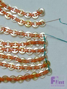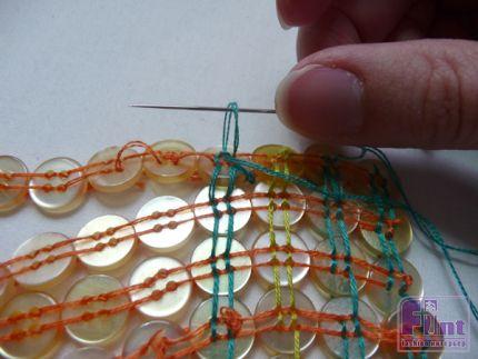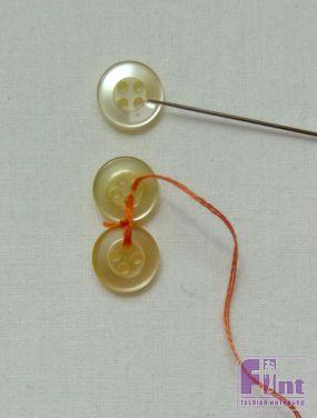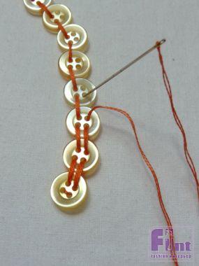 Сначала используем оранжевые ниточки. Возьмите пуговку и проденьте иголку с ниткой в одну дырочку, сделайте аккуратный узелок. Возьмите еще одну пуговку и проденьте иголку с ниткой через две, идущие дург за другом, дырочки. Проделайте тоже самое в обратную сторону. В цепочке должно быть 9 пуговок.
