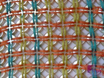 Соедините голубой ниткой первых два ряда. Третий ряд соедините зеленой ниткой, потом снова два ряда голубой и т.д.