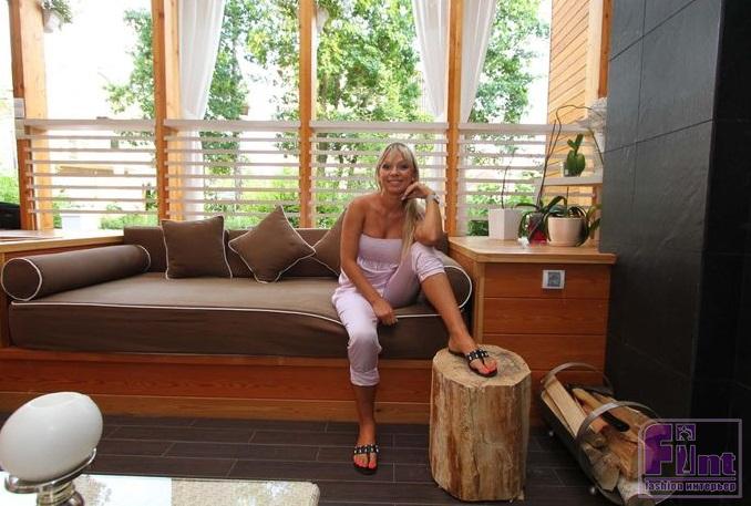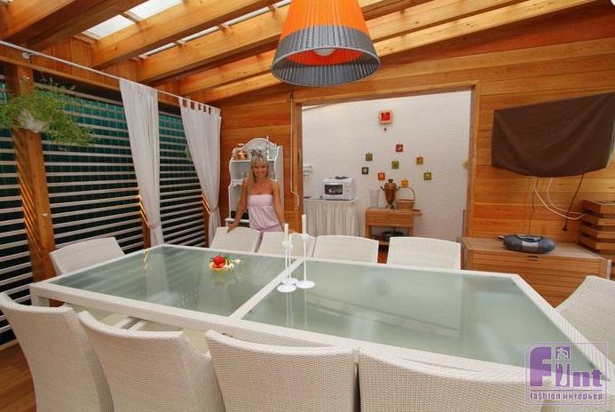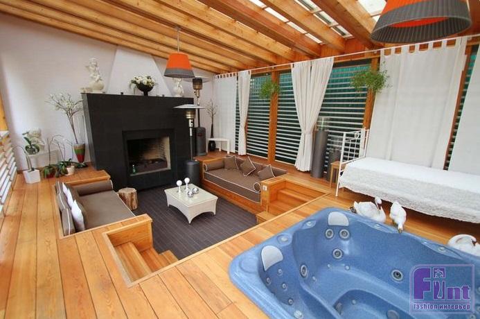 Все три этажа в доме Салтыковой отделаны в стиле арт-деко. Но при этом каждая комната имеет свой неповторимый вид. Нам первом этаже расположены гостиная, столовая, библиотека, сауна и кабинет хозяйки. К нему примыкает летняя веранда, на которой есть камин, уютный диван и… джакузи.