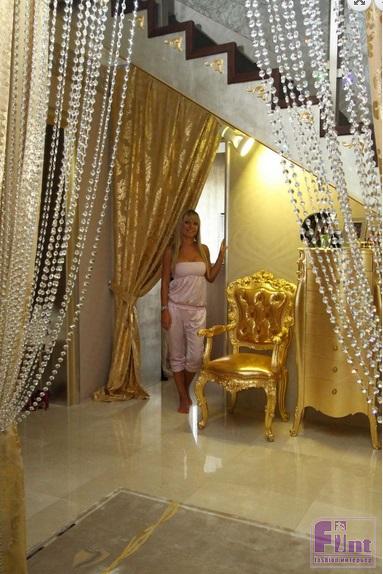 Все три этажа в доме Салтыковой отделаны в стиле арт-деко. Но при этом каждая комната имеет свой неповторимый вид. Нам первом этаже расположены гостиная, столовая, библиотека, сауна и кабинет хозяйки. К нему примыкает летняя веранда, на которой есть камин, уютный диван и… джакузи.