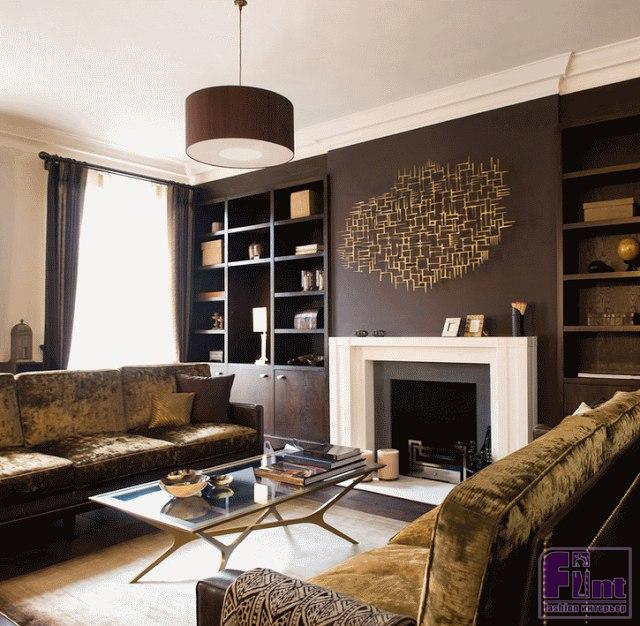 Сочетание золотого в интерьере отлично подходит к строгой шоколадно-терракотовой гамме. Если в помещении присутствует деревянная мебель, коричневые покрывала или гардины, золото придаст дополнительный свет и блеск. В этом случае можно выбрать золотую краску для отделки стен, шторы или аксессуары.